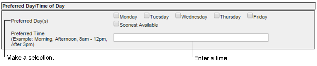 2. Select either the Preferred Day/Time of Day or Specific Day/Time of Day Request radio button.