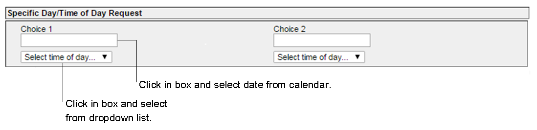 • For Specific Day/Time of Day Request, select a date from the calendar, then select time of day.