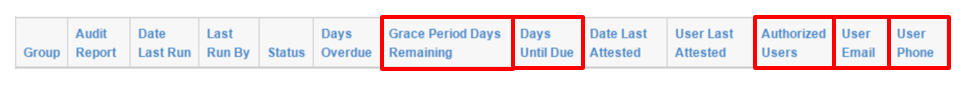 Days Until Due The number of days left until reports are due to be run again when the report is in a current status. This value is calculated using system setting C-Maximum Number of Days Between Audit Report Checks.