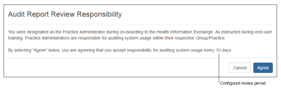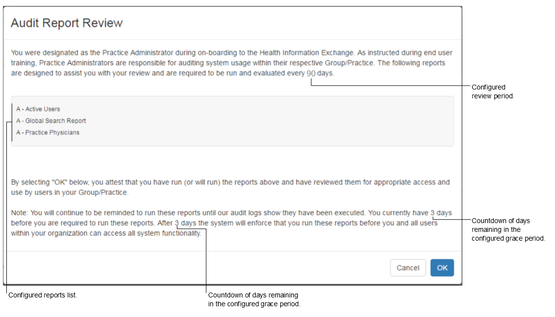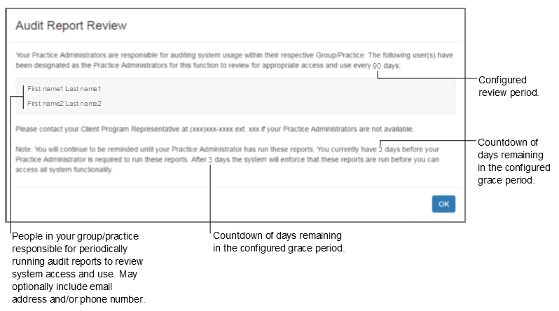 If you are an authorized group/practice administrator, the system displays the Audit Report Review message to you if reports are not run before the review period ends. The message is configurable. When audit report check is enforced, the message is intended to notify you that you are in the grace period and remind you to run the reports. Grace period does not apply when audit report check is not enforced.