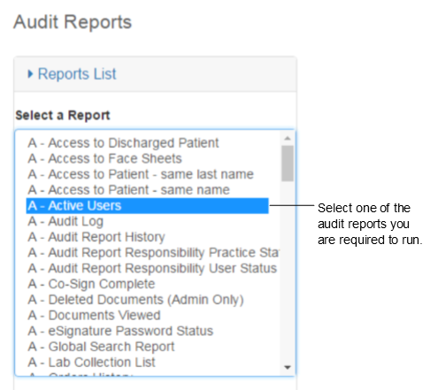 To help ensure that compliance with your organization's legal, privacy, and security policies, your group/practice administrator may be required to periodically run and review designated audit reports to monitor system use. For example, your system may be configured for the A - Active Users, A - Global Search Report, and A - Practice Physicians reports to be run and reviewed every 90 days to ensure that the portal is being accessed and used according to policy.