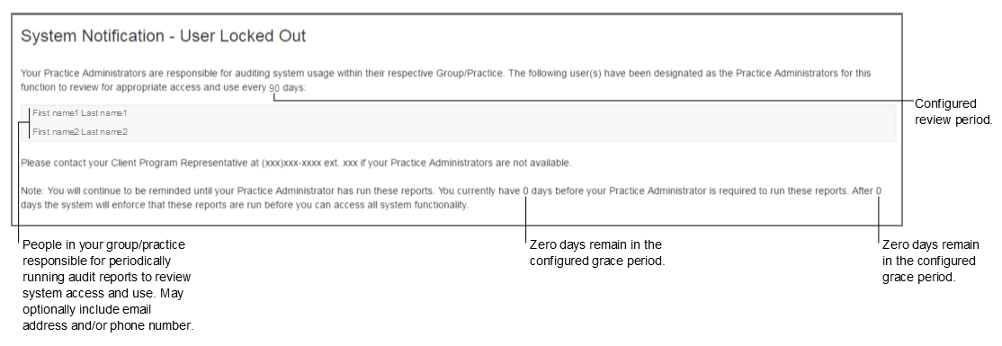 Also see System Notification - Group/Practice Administrator Limited FunctionalityUser Locked Out, and System Available Email