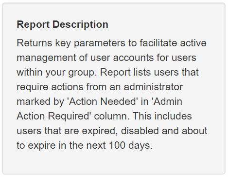 Admin Action Required This column is valued to Action Needed if the user account is expired, disabled, or expiring in the next 100 days.