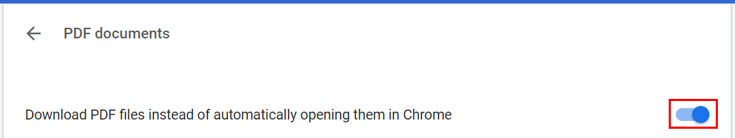 - Select the blue circle to turn off Download PDF files instead of automatically opening them in Chrome.
