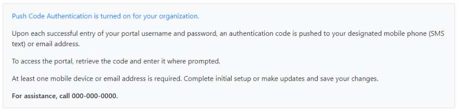 10. If Push Code Authentication functionality is on and you updated any related elements, select the user-agreement check box. This confirms your agreement to use the email address or mobile device information provided to receive an authentication code to access the portal. This step is required before you can save any push code authentication-related profile changes.