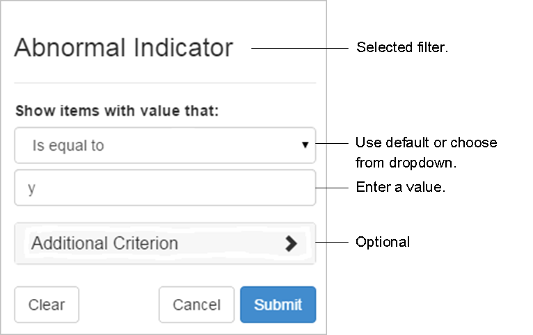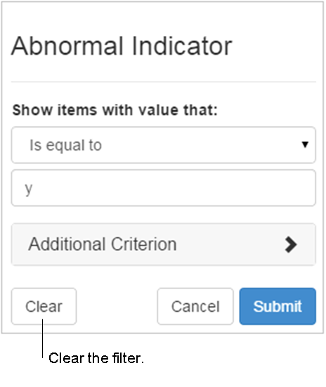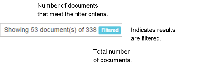 - Select Submit to apply the filter. Documents that meet the search criteria are displayed. When applied as a filter, a filter icon is displayed to the right of a column heading, and to the left of a column name in the Filters list. In addition, the following information is displayed above the grid when filters are applied: the number of documents that meet the criteria, the total number of documents, and a blue box labeled: Filtered.