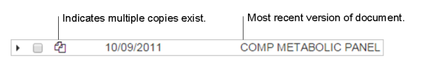At the document level, the multiple documents icon indicates that multiple copies of the same document exist. The most recent version of the document is displayed next to the multiple documents icon. Select the right arrow icon to expand the view.