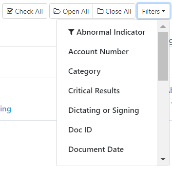 Use Quick Filters to search for a patient's documents. Select the Filters button to perform more specific filtering. See Filters for more information. The following Quick Filters are available: