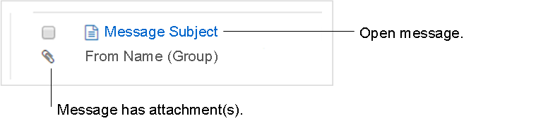 - Subject / From / On Behalf Of - The message subject is a link. Click the message subject to open the message. This column also indicates who sent the message and if it was sent on behalf of someone.