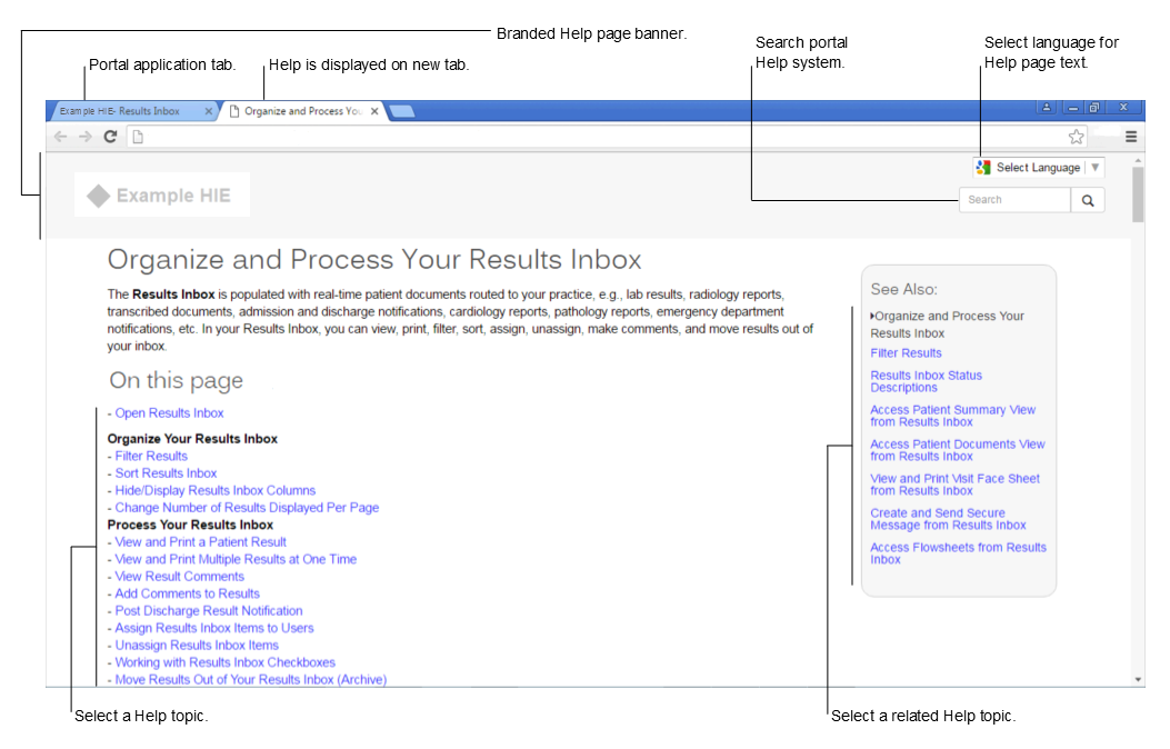 Select the help icon on portal pages* to access Help. Help is displayed on a new tab in your browser. This enables you to toggle between the portal application and the associated Help. Help topics are context-aware and based on the portal function you are accessing, for example if you select the help icon from the Results Inbox page, Help for Results Inbox is displayed.